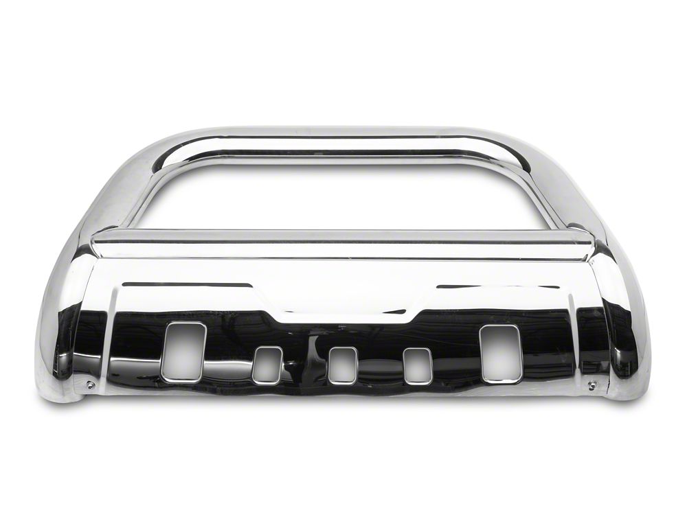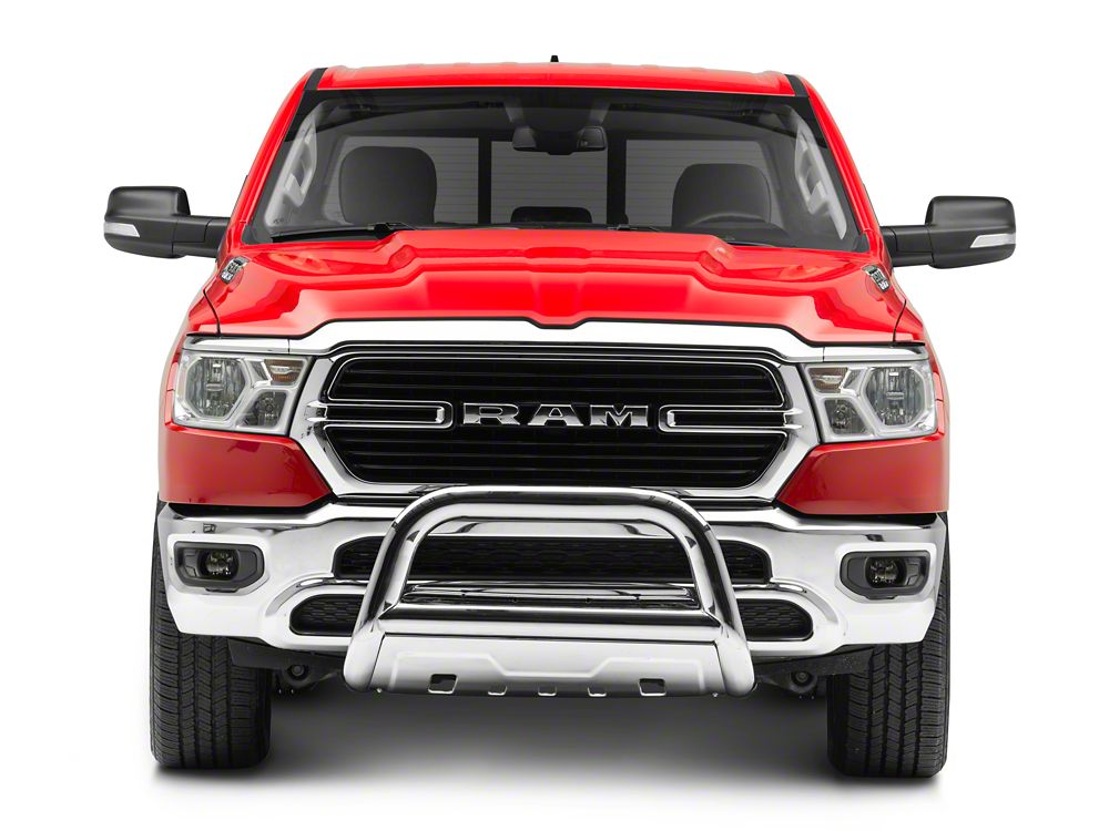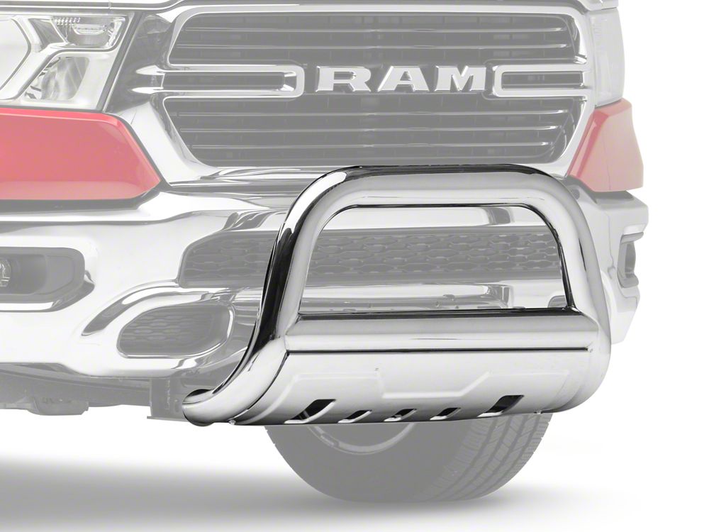 Front-End and Undercarriage Protection. With the Barricade 3.50-Inch Oval Bull Bar with Skid Plate; Stainless Steel installed on your RAM 1500 truck, you will not have to worry about impact, stone chips, or other harmful elements or situations causing considerable damage to its front end. This bull bar even comes with a great bonus: an integrated skid plate to protect the undercarriage when riding on rocky or bumpy terrain.