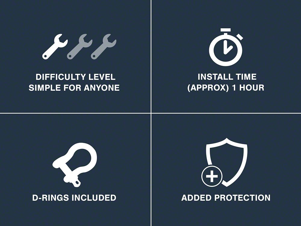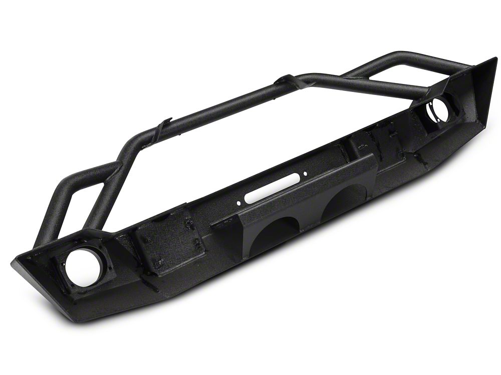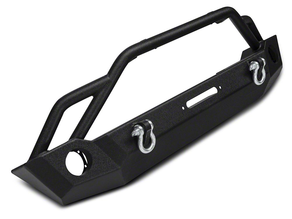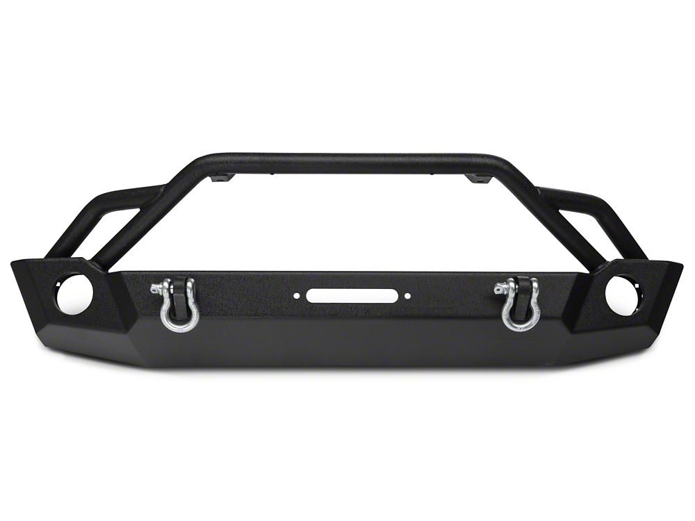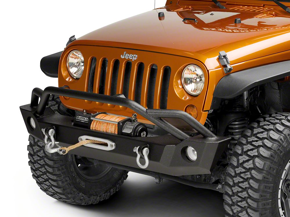 Heavy Duty Construction. Manufactured from 3/16" steel, this front Wrangler bumper is completed in a tough wrinkle black powder coating for long lasting durability and corrosion resistance. The D-Ring mounts are welded to provide extra strength and equipped with 4 3/4 ton rated D-rings for intense recovery.
