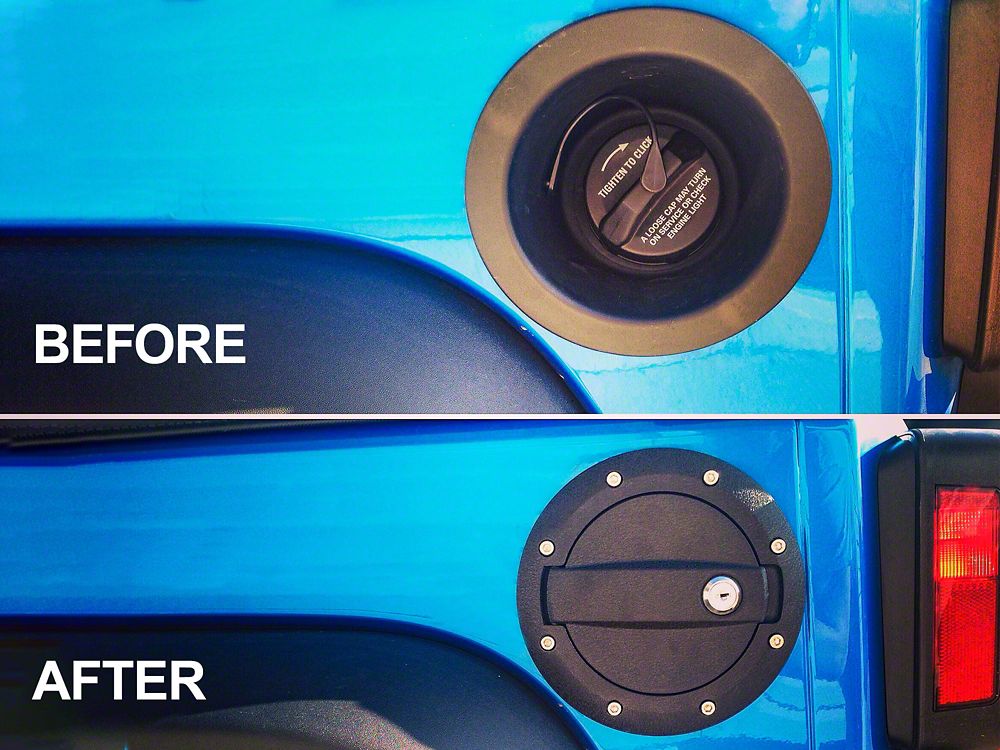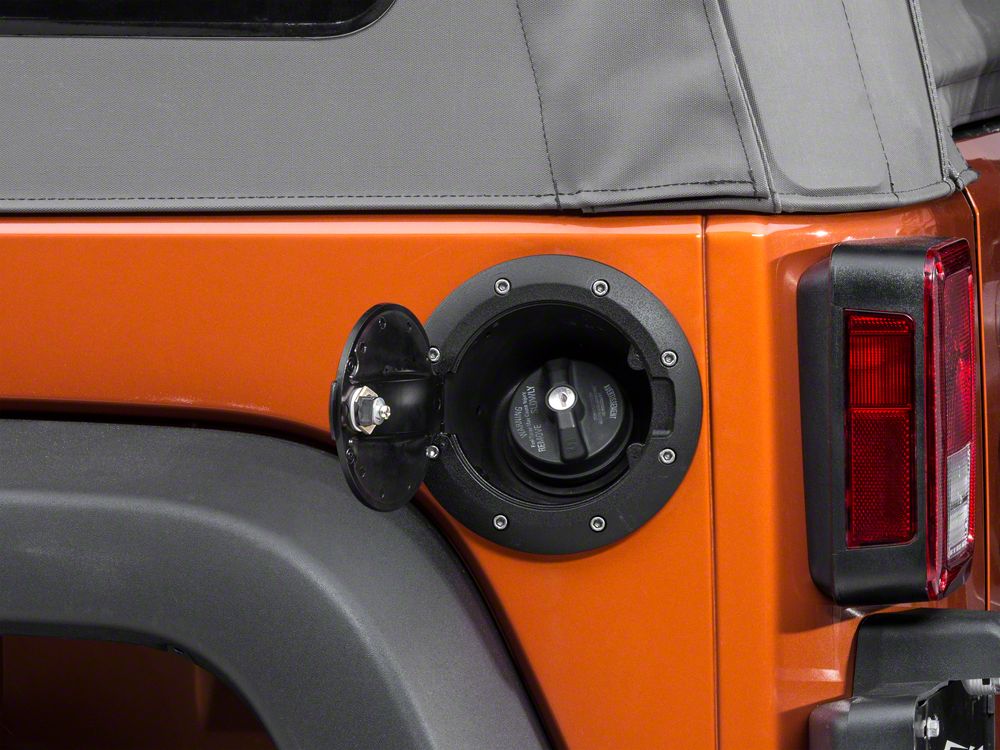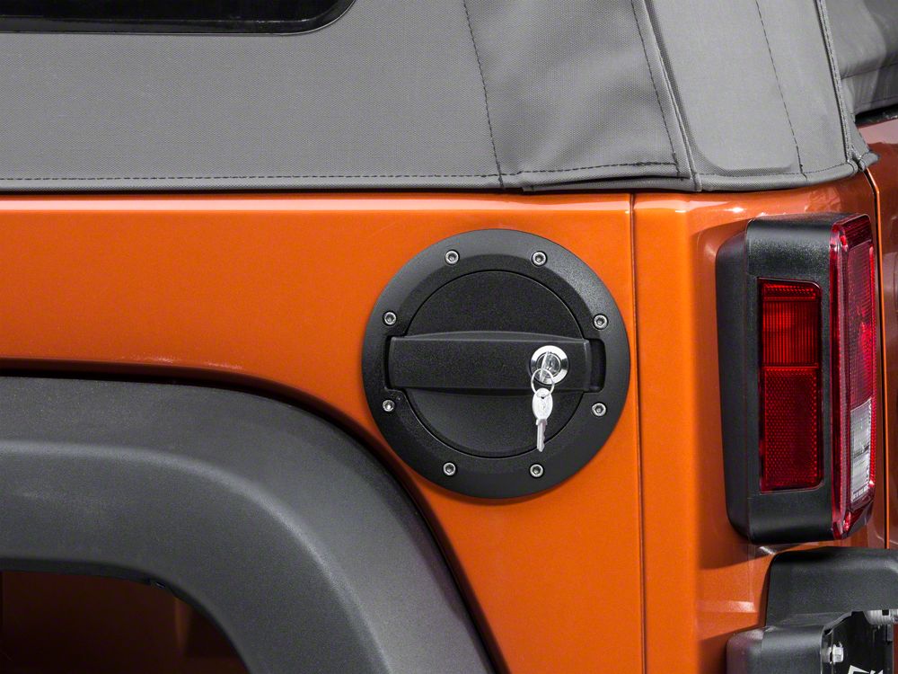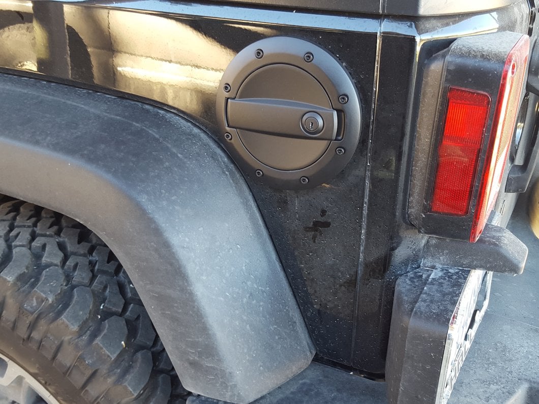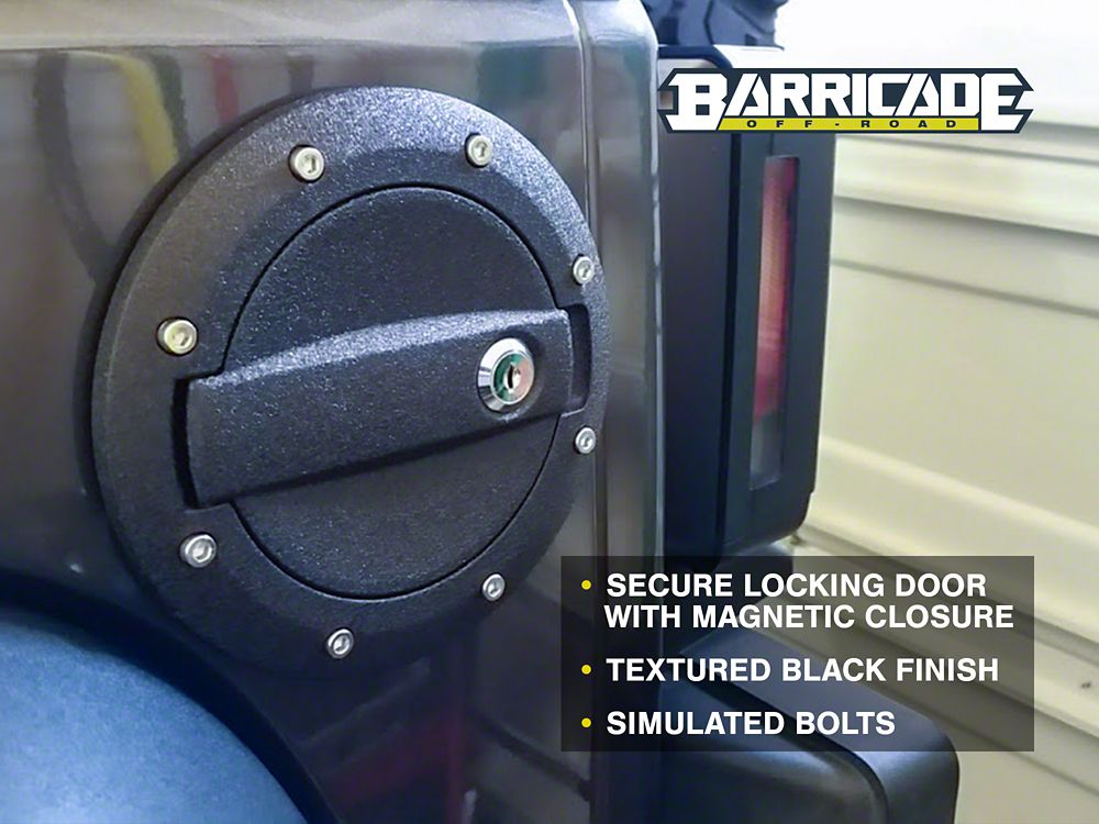 Rugged Styling. Get rid of that exposed gas cap look and upgrade to the rugged off road styling of a Barricade Off-Road Locking Fuel Door. A Barricade Off-Road Fuel Door adds an extra level of customization to any JK Wrangler for an aggressive appearance. Not only will this textured black fuel door look great, but it also adds superior protection to your Wrangler.