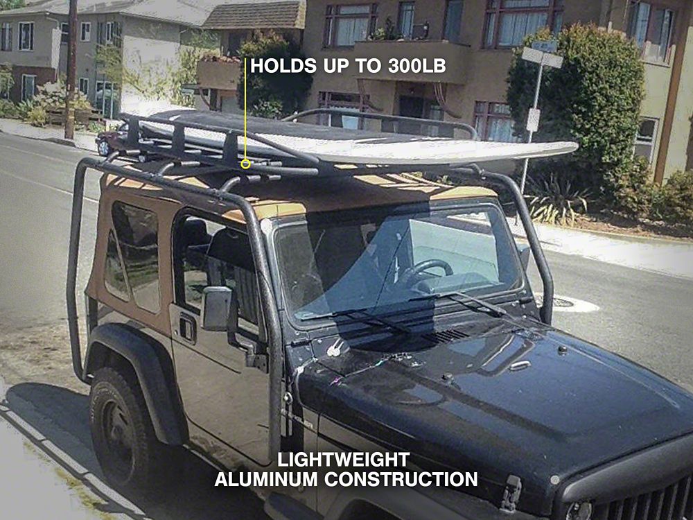 Lightweight Construction. Manufactured from lightweight aluminum tubing, this Barricade Roof Rack Basket is completed in a textured black powder coat finish for aggressive good looks and long lasting corrosion resistance. This Basket measures 50"W X 70"L and has a weight capacity of 300 lbs.