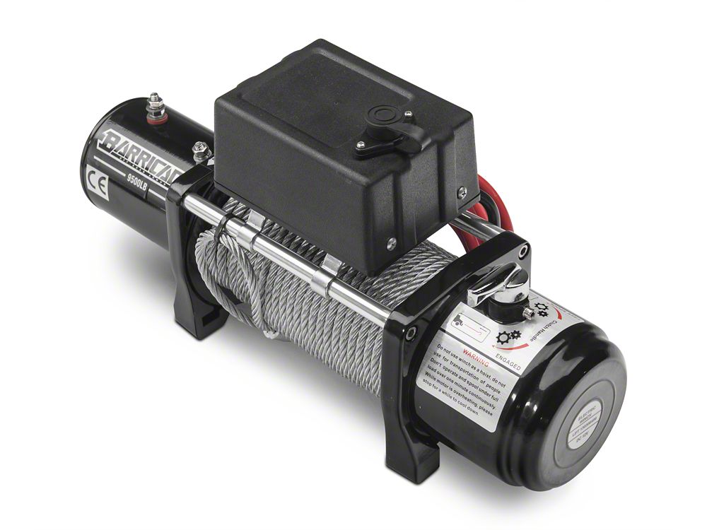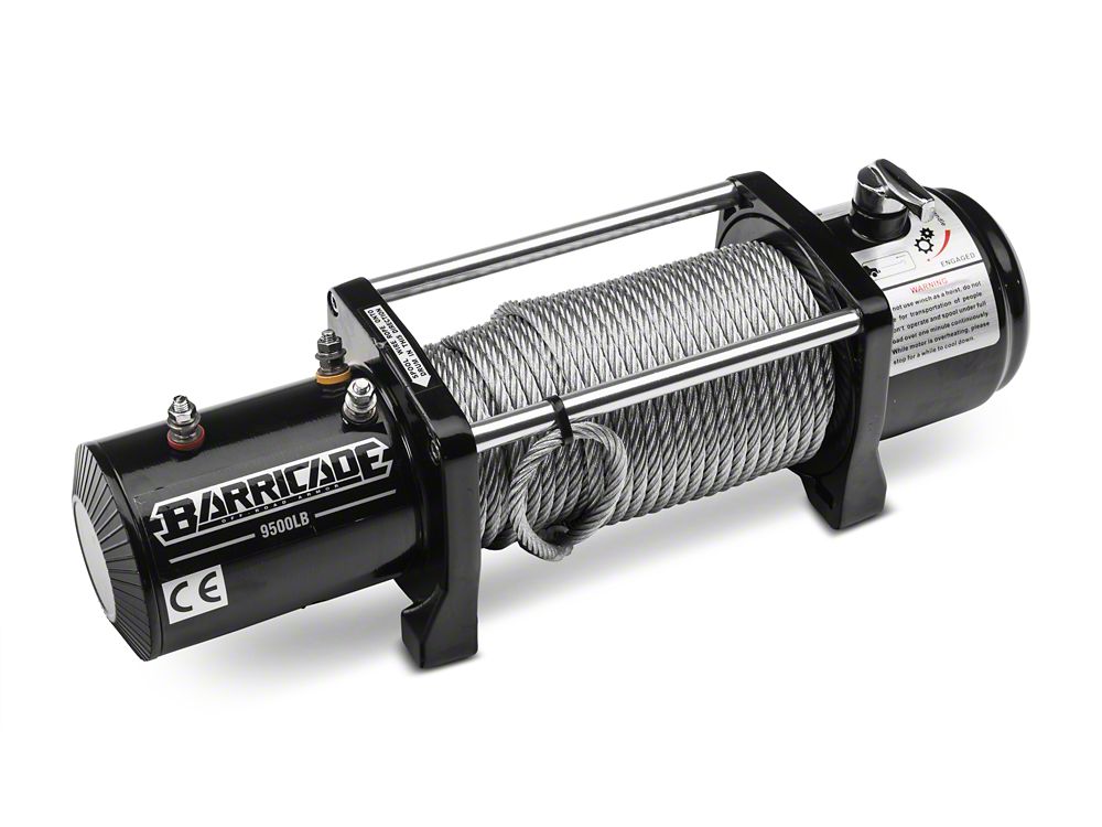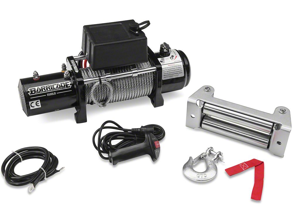 Heavy Duty 9500 LB Winch. The included Barricade Winch is driven by a powerful 5.5 HP series-wound 12-volt electric motor. Featuring a rugged 3-stage planetary gear box with a 195.4:1 gear ratio, this Winch provides 9500 lbs of pulling power. Matched with a sliding ring gear clutch and a two-way automatic, in-the-drum braking system, you know you can always rely on this winch to hold your rig. A 4-way aluminum roller fairlead helps to reduce wear and tear on the included 21/64" steel cable. This Barricade Winch also includes a wired remote control with a 12 foot lead, allowing you to safely stand clear when in operation.