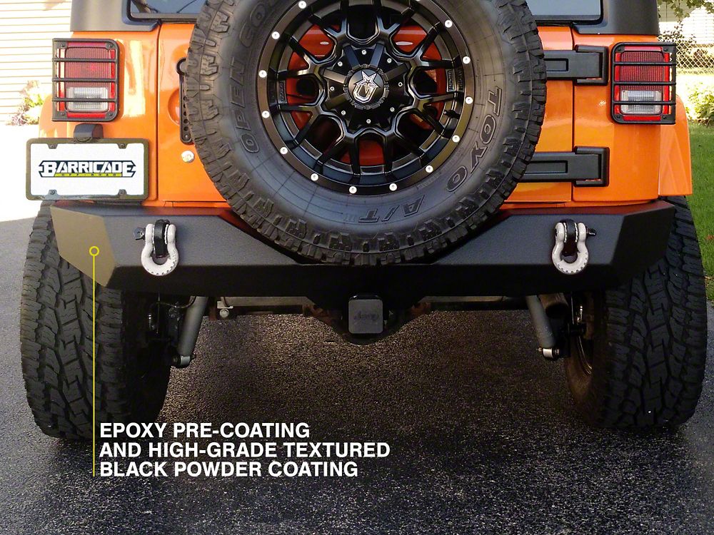 Heavy Duty Construction. Manufactured from 3/16" mild steel plating this Barricade Off-Road Rock Crawler Rear Bumper is completed in a two stage finish using epoxy precoating and high-grade textured black powder coating for long lasting durability. The D-Ring mounts are welded both inside and outside for extra strength.